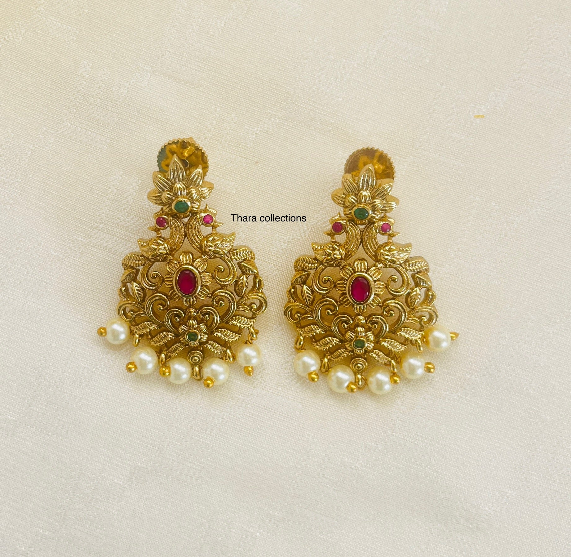 This exquisite antique gold-plated necklace set is a true masterpiece, featuring an intricate pendant adorned with ruby-colored stones and pearl drops. The beautifully crafted chain is embedded with delicate floral and peacock motifs, enhanced with emerald and ruby embellishments for a regal touch. Paired with matching statement earrings, this set is perfect for weddings, festivals, and traditional occasions.