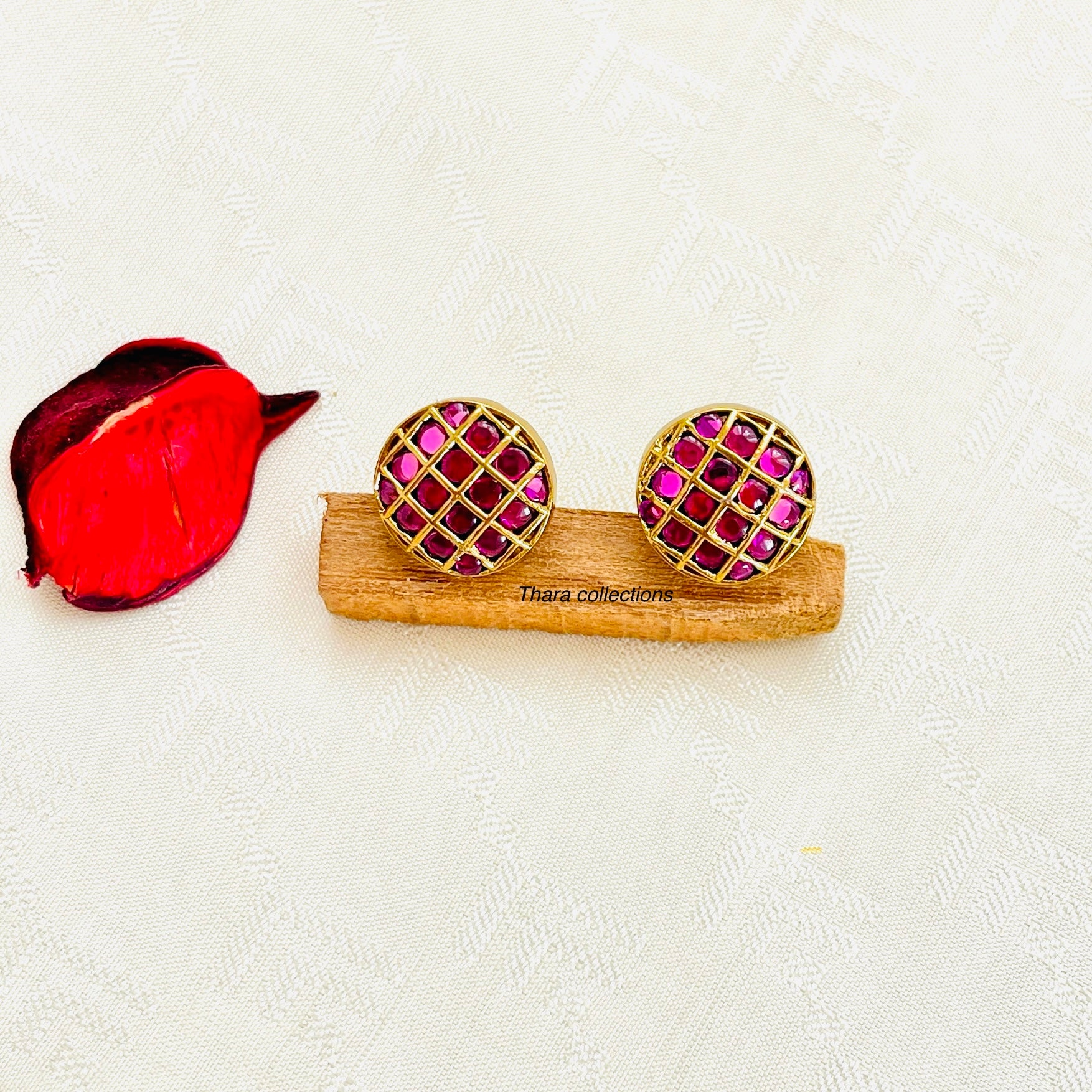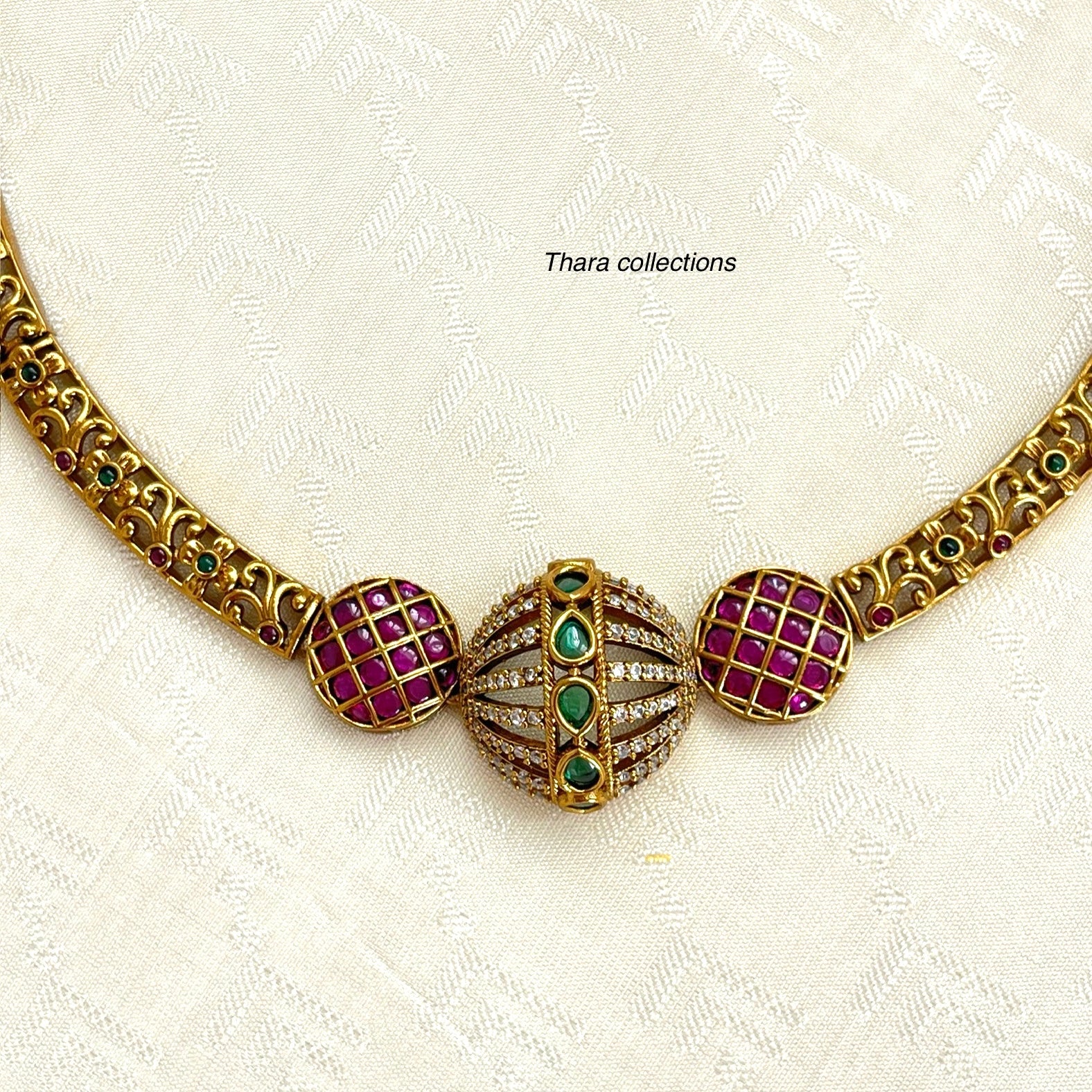 Embrace the charm of traditional elegance with this stunning antique gold-plated temple choker set. Featuring intricate craftsmanship, this choker showcases a classic blend of ruby-pink and emerald-green stones set in a detailed filigree design. The central motif, adorned with sparkling embellishments, adds a regal touch, making this set perfect for ethnic and festive occasions.