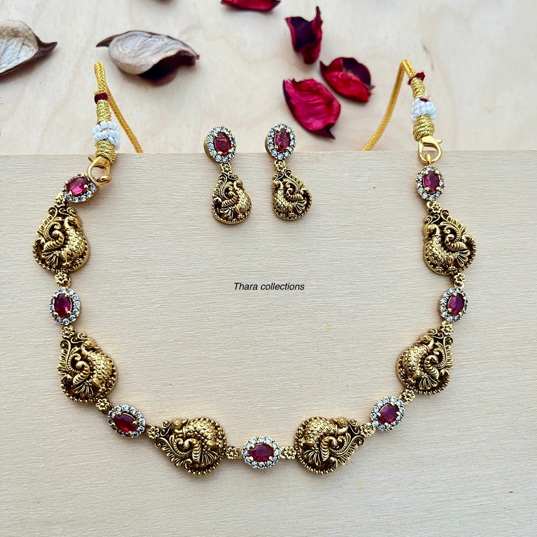 Turn heads with this beautifully crafted antique gold necklace set featuring intricate peacock motifs and rich ruby-colored stones. A perfect blend of traditional elegance and festive charm, this set is designed to elevate your look without breaking the bank.