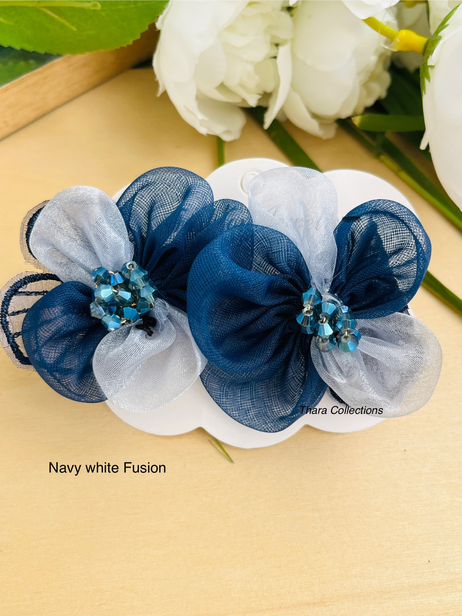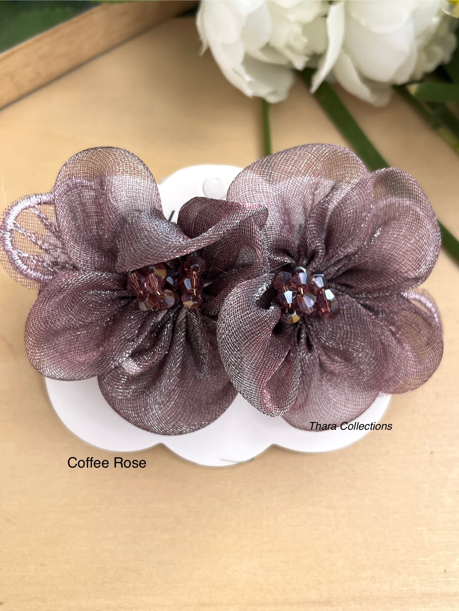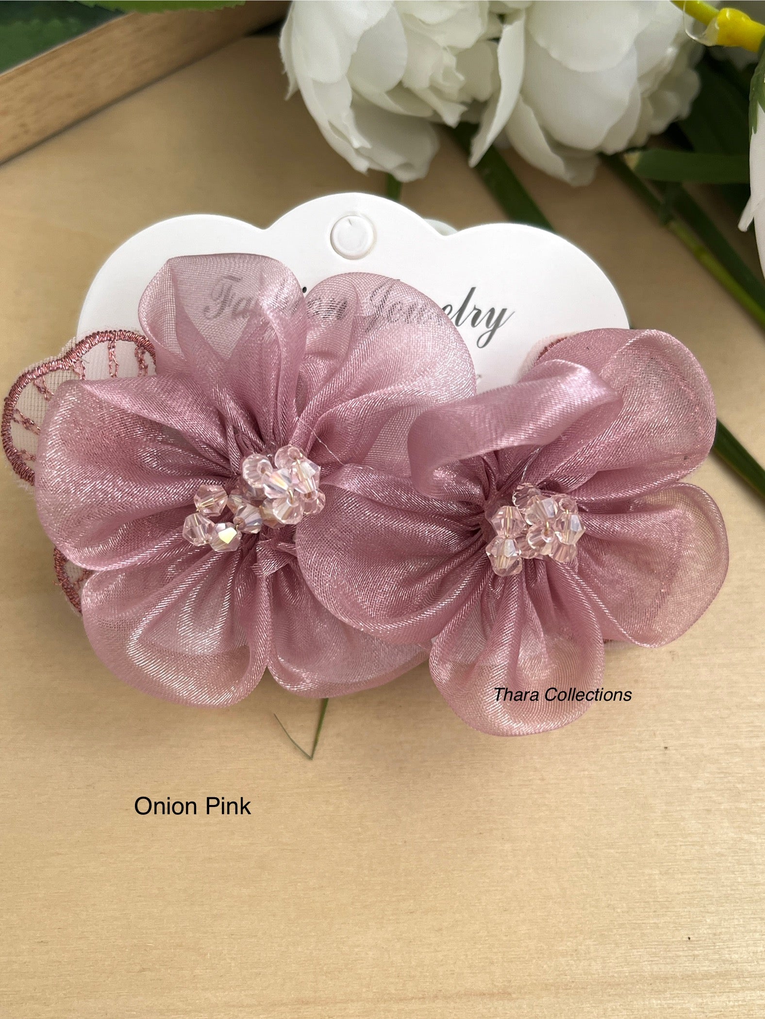 Turn everyday hairstyles into floral fantasies with our Bloom & Shine Center Hair Clip. Designed with delicate dual organza flowers and beaded centers, this clip blends charm and elegance in every detail. Whether it’s a casual day out or a festive function, this clip adds a soft, graceful touch to your look.