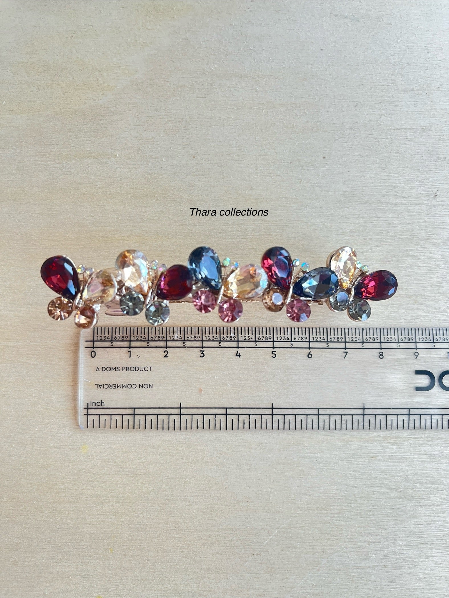 Enhance your hairstyle with our Elegant Gemstone Butterfly Hair Barrette, designed with rich, jewel-toned crystals and delicate butterfly details. The dazzling mix of deep red, navy blue, and crystal-clear stones creates a captivating look that’s perfect for both everyday elegance and special occasions.