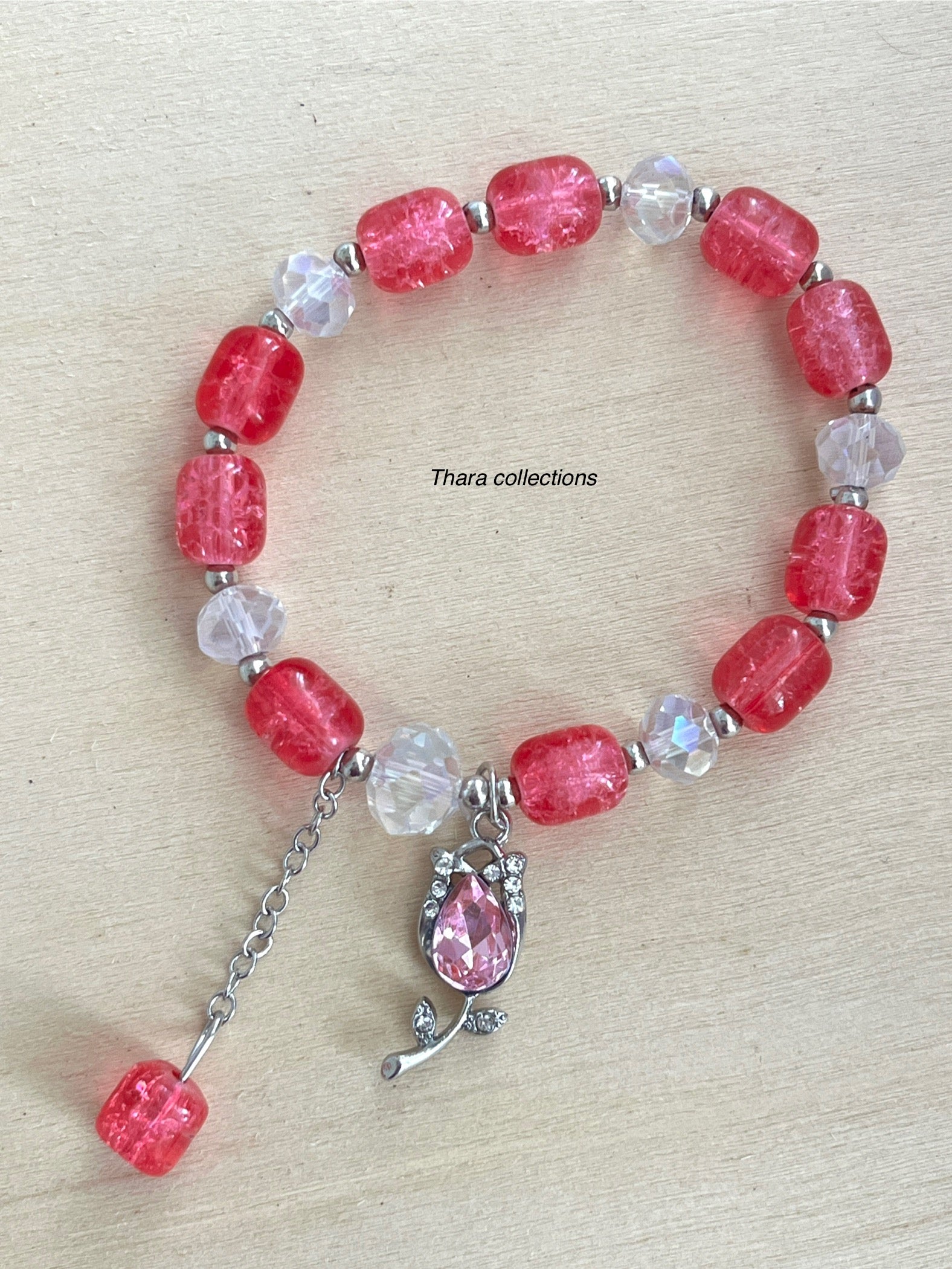 Add a touch of sparkle and elegance to your jewelry collection with our handcrafted beaded charm bracelet. Featuring high-quality crackle glass beads in a beautiful red shade, accented with metallic spacers and crystal-clear faceted beads, this bracelet is perfect for everyday wear or special occasions.