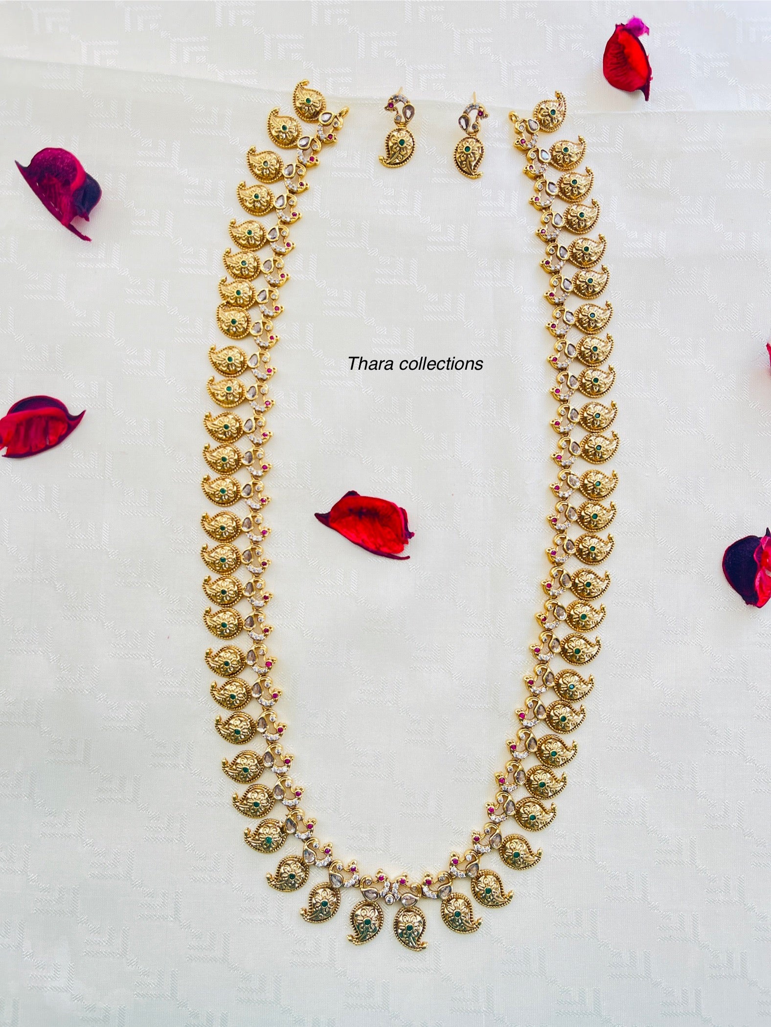 A graceful long haram adorned with intricate paisley motifs and sparkling embellishments, designed for a traditional yet timeless look. Perfect for weddings, festive occasions, and cultural celebrations, this necklace adds a regal touch to any attire. Paired with delicate matching earrings for a complete look.