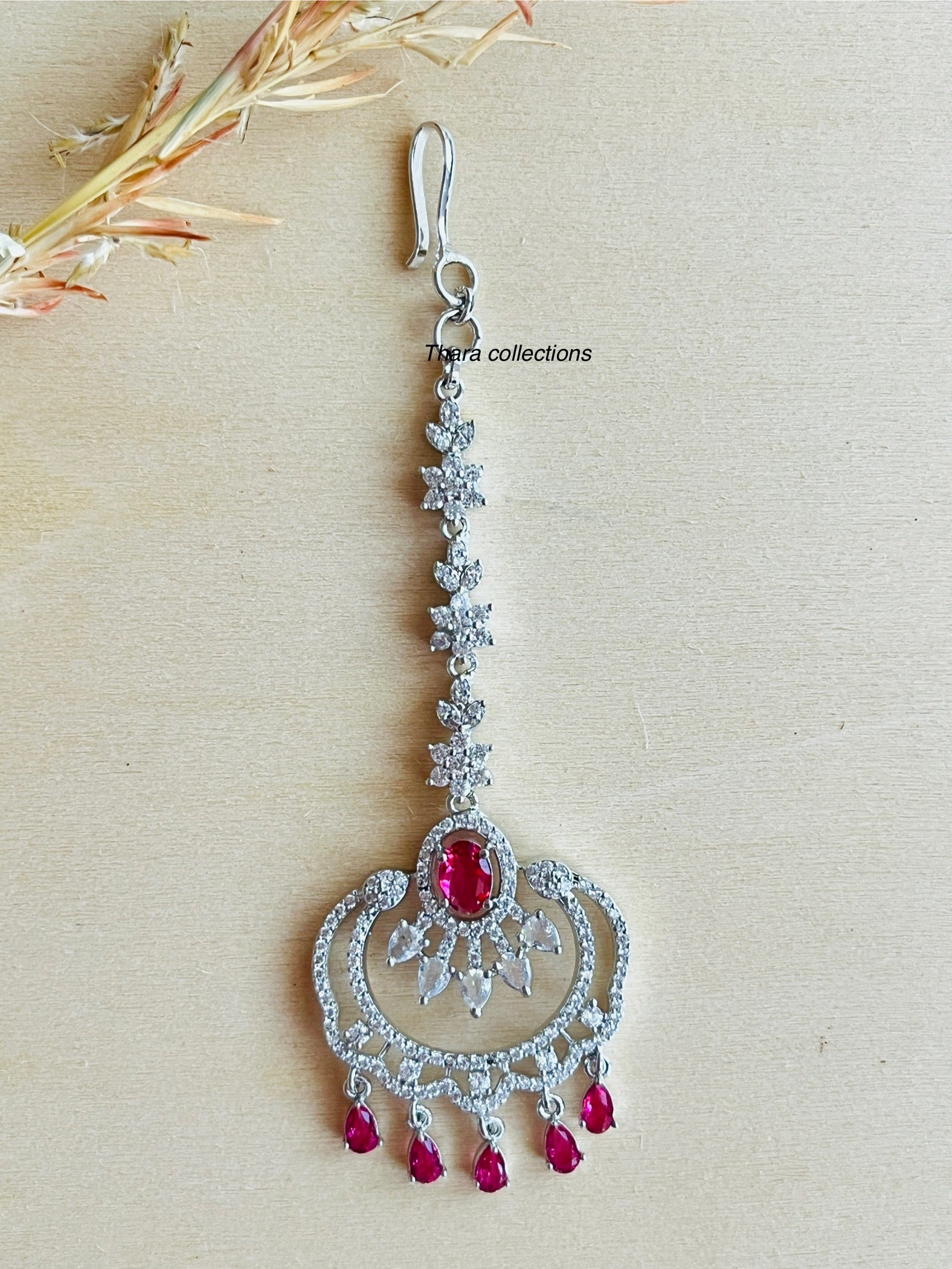 Add a touch of royalty to your look with this stunning silver-finish maang tikka. Featuring a dazzling stone centerpiece surrounded by intricate crystal detailing, this accessory is perfect for weddings, festive occasions, or special events. The delicate dangling beads enhance its charm, adding movement and elegance to your hairstyle.