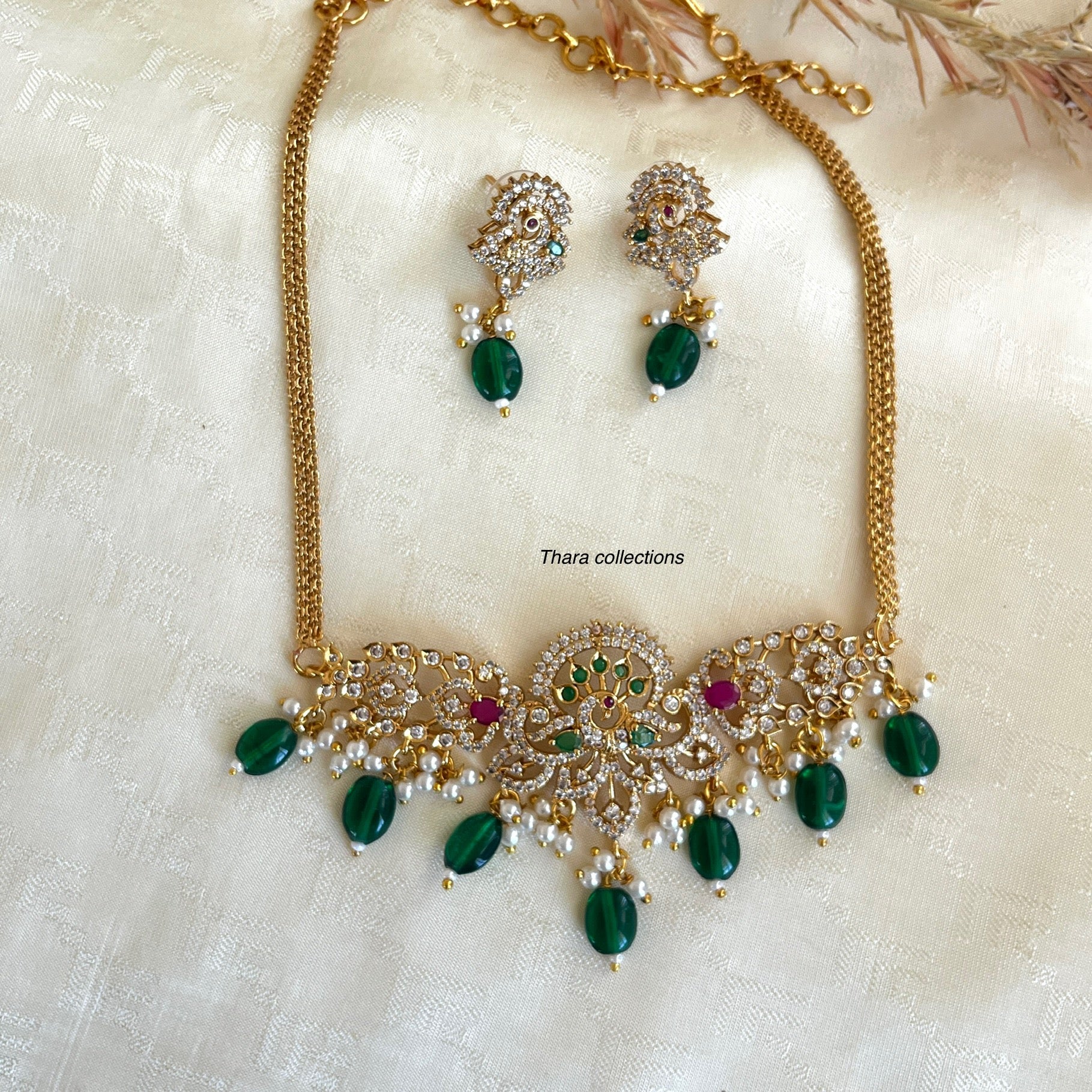 This exquisite necklace set features a dazzling peacock motif adorned with shimmering white stones, rich ruby accents, and striking green beads. The intricate filigree work, paired with delicate pearls, enhances its royal appeal. Designed for those who love to embrace tradition with a modern twist, this set is perfect for festive celebrations, weddings, and special occasions.