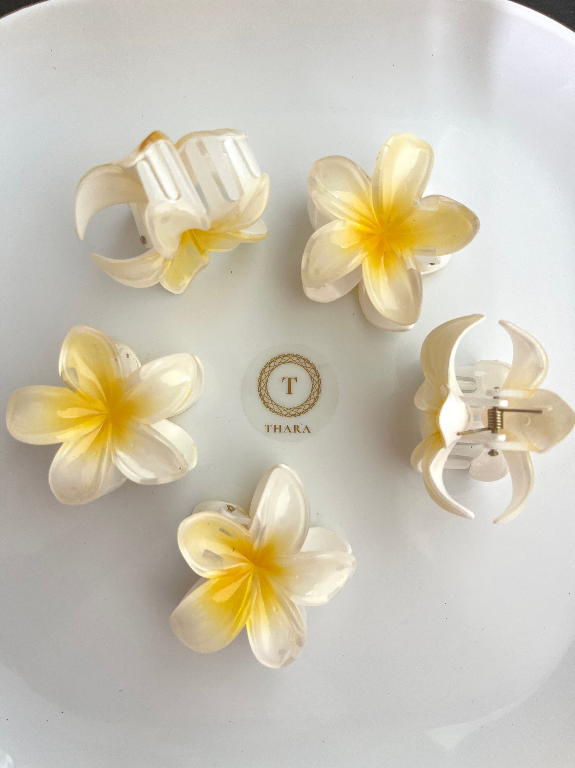 Bring a tropical touch to your hairstyle with these medium-sized Plumeria Flower Hair Claw Clips. Each clip is decorated with vibrant floral details, making them both stylish and practical for everyday use.