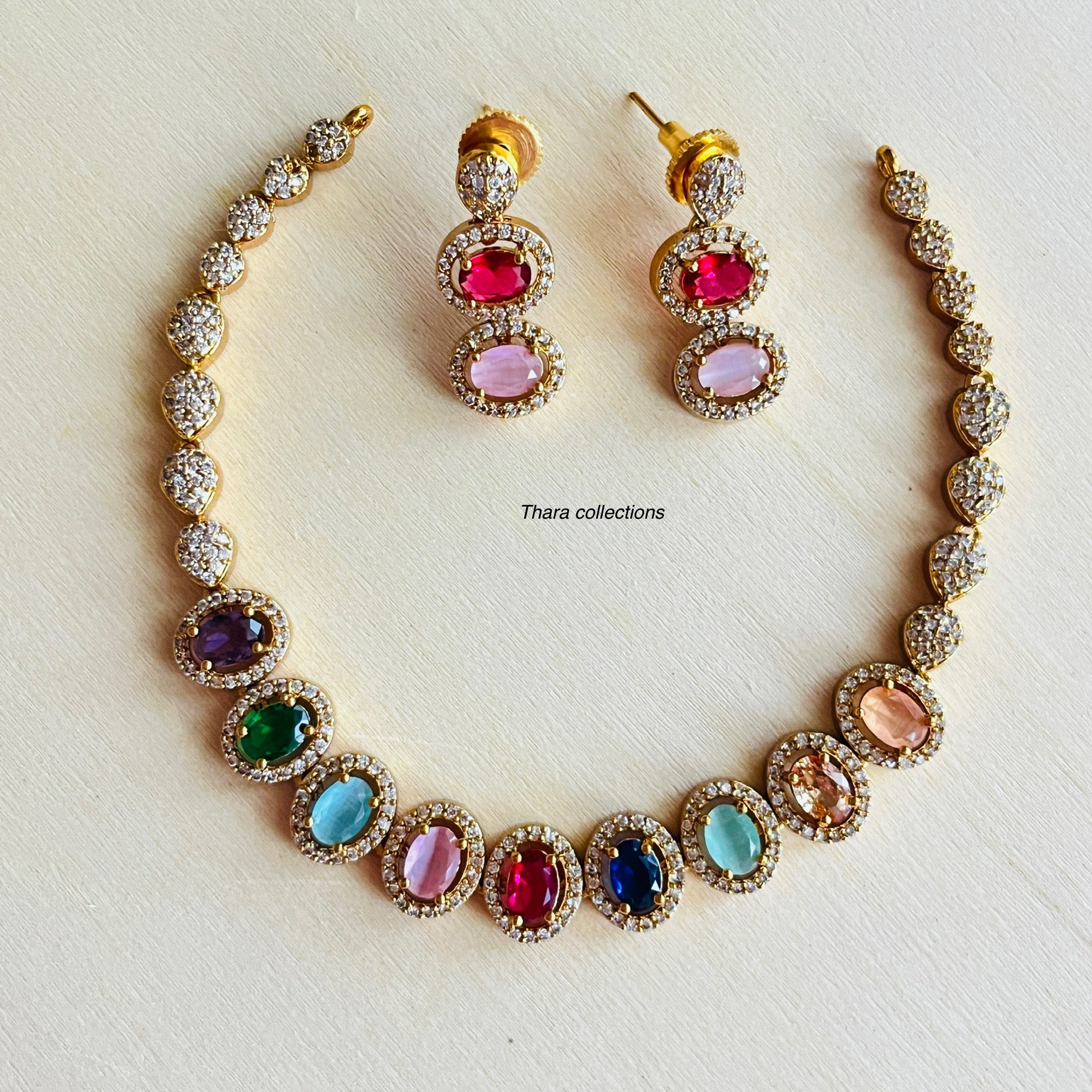 Add a vibrant touch to your look with this stunning multicolor stone embellished necklace set. Featuring beautifully crafted oval gemstones surrounded by sparkling stones, this set exudes elegance and charm. The matching earrings complement the necklace perfectly, making it ideal for special occasions, parties, or traditional outfits.
