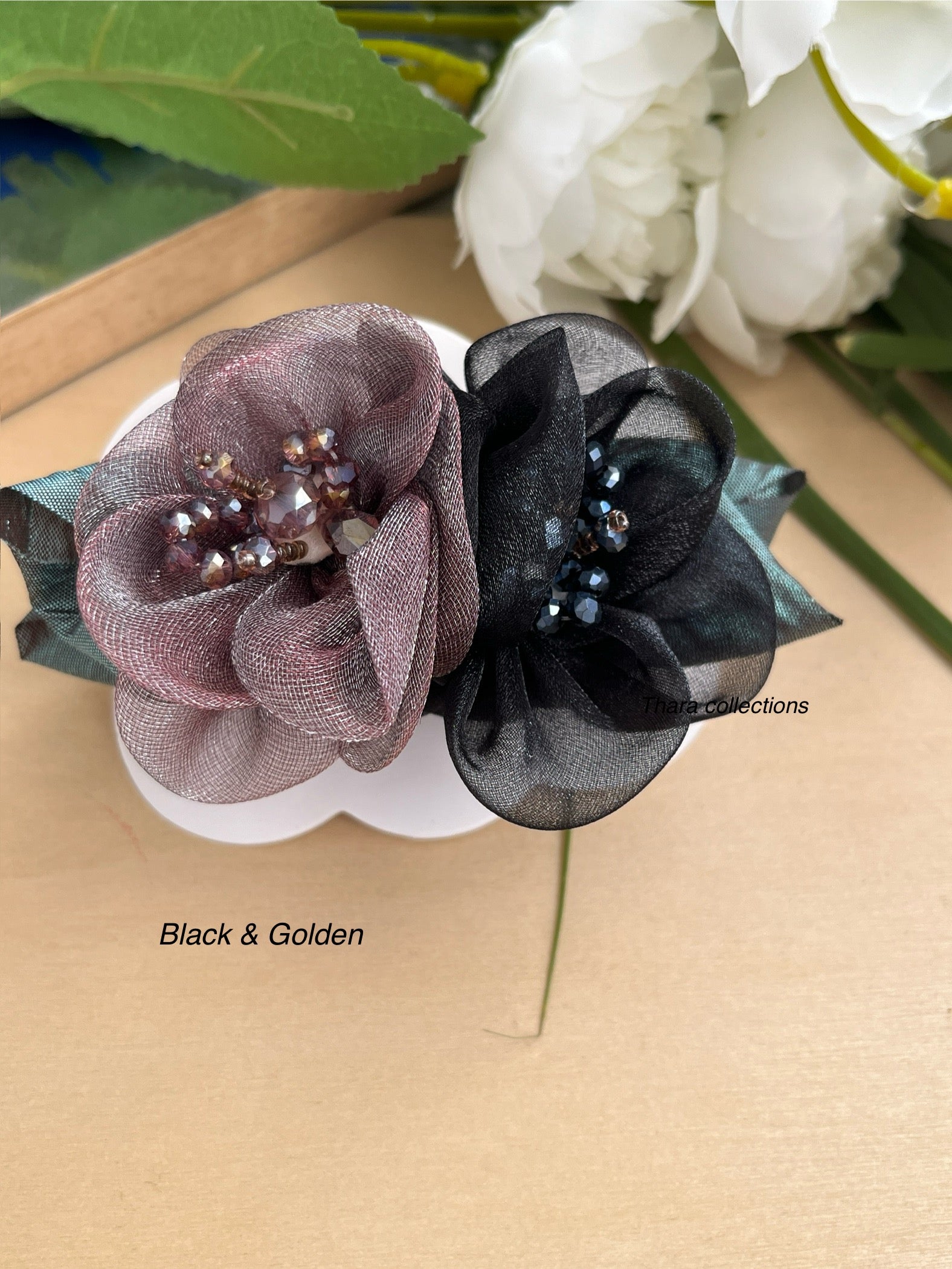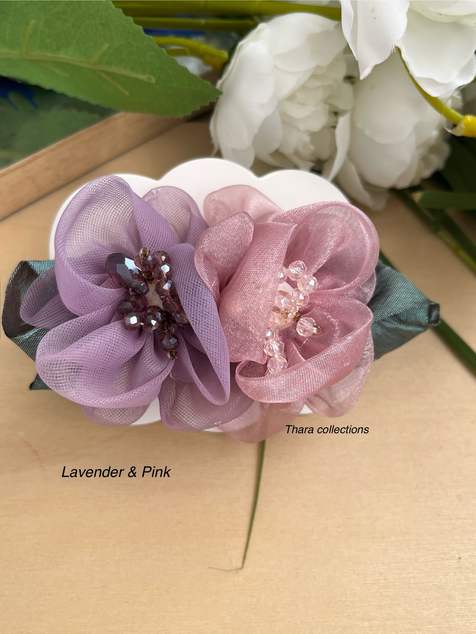 Step into elegance with our Petal Bloom Double Flower Clip – a charming hair accessory featuring soft organza flowers paired with realistic leaf accents. With delicate beadwork at the center, this clip is perfect for both everyday glam and festive looks. Its sturdy grip and stylish flair make it ideal for kids and women alike.