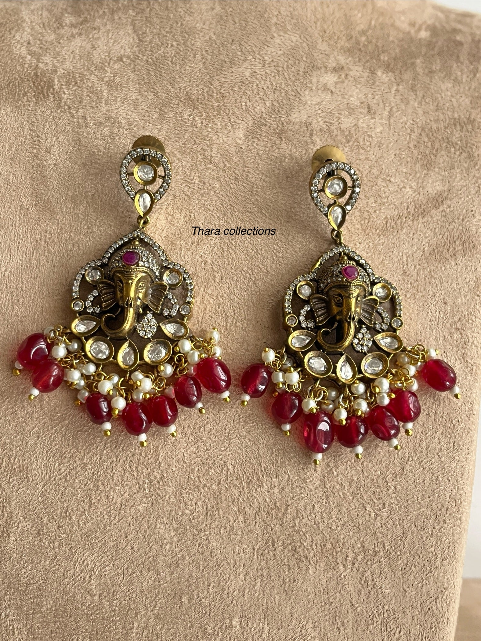 Elevate your traditional and festive look with this exquisite Victorian-style multi-layered ruby beads necklace featuring a majestic Ganesha pendant. The necklace is adorned with high-quality uncut polki stones, pearls, and gold-plated detailing, making it a statement piece for grand occasions. The intricately designed side clasps add a touch of royalty, ensuring a luxurious finish.