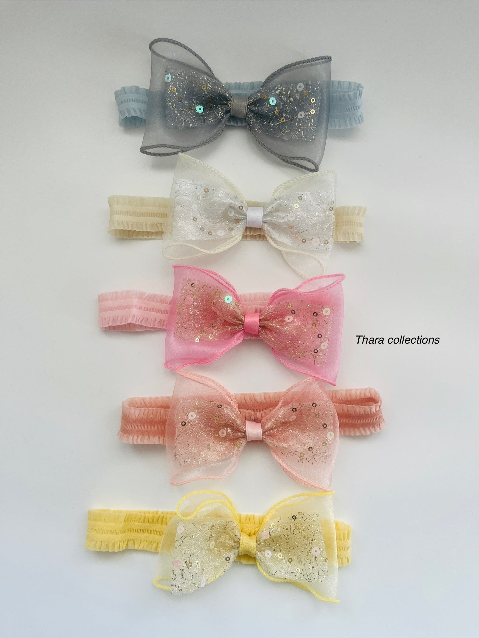 Add a touch of glamour to your look with our Sparkling Elegance Bow Headband. Featuring a delicate ruched band and a sheer organza bow adorned with shimmering sequins and metallic thread detailing, this headband is perfect for elevating any outfit. Lightweight, comfortable, and available in a variety of stunning shades, it’s an ideal accessory for special occasions, parties, or everyday sparkle.