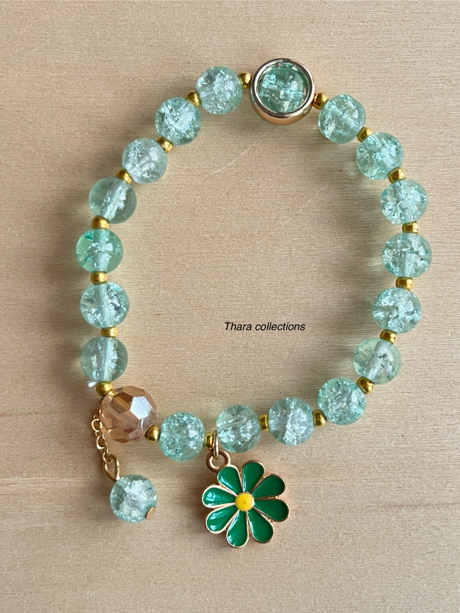 Add a touch of charm to your wrist with our handcrafted beaded bracelet. Featuring crystal white crackle beads, gold-tone accents, and a beautiful green enamel daisy pendant, this bracelet is perfect for adding a playful yet elegant touch to any outfit. The adjustable design ensures a comfortable fit for all. Perfect for casual wear, gifting, or stacking with other bracelets!