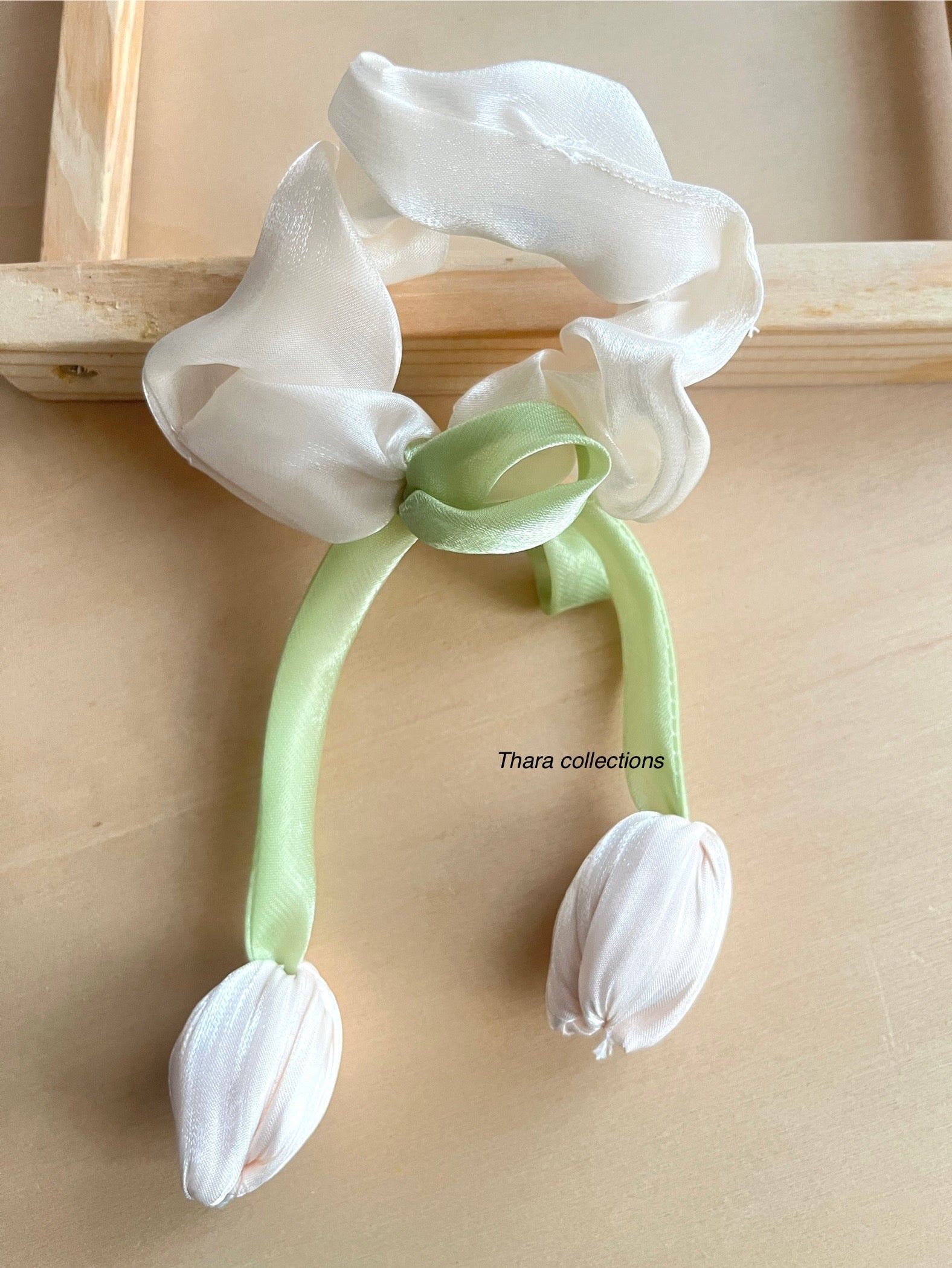 Elevate your everyday hair game with our Tulip Bloom Scrunchies, designed with delicate fabric tulip flowers stitched onto soft, stretchable scrunchies. These are perfect for adding a soft romantic touch to your ponytails or buns while being gentle on your hair.