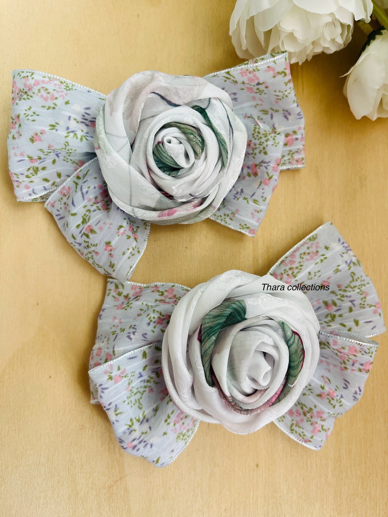 Bring timeless charm to your hairstyle with our Vintage Garden Bow Clips. Each clip features a soft rosebud center paired with floral fabric bows in delicate pastel prints. These clips are perfect for adding a subtle yet stylish touch to braids, ponytails, or half-up styles.