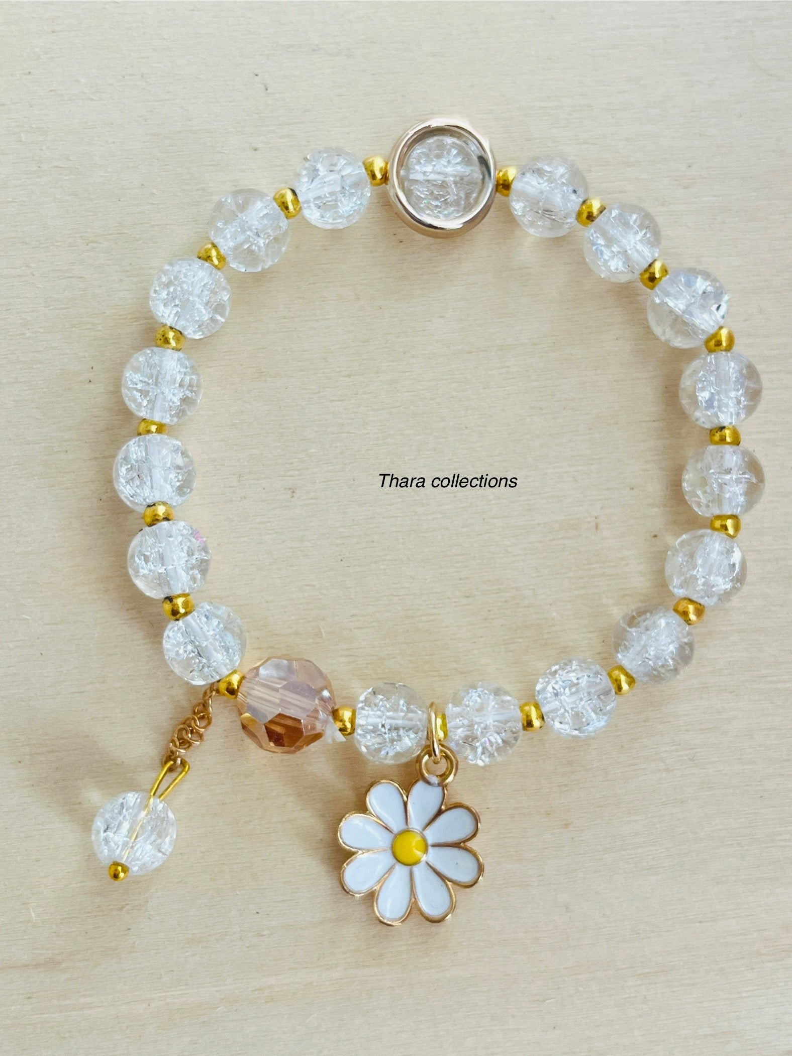 Add a touch of charm to your wrist with our handcrafted beaded bracelet. Featuring crystal white crackle beads, gold-tone accents, and a beautiful white enamel daisy / character pendant, this bracelet is perfect for adding a playful yet elegant touch to any outfit. The adjustable design ensures a comfortable fit for all. Perfect for casual wear, gifting, or stacking with other bracelets!
